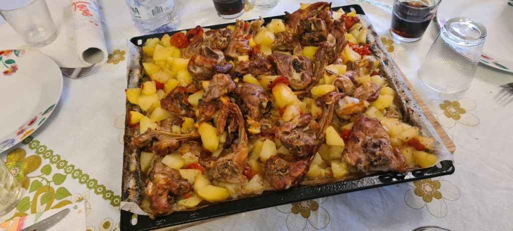 Il capretto sarà cotto dopo circa 1:30/2:00 ore e quando i pomodrini risulteranno appassiti, le patate dorate e un po’ sfarinate e il capretto ben cotto.