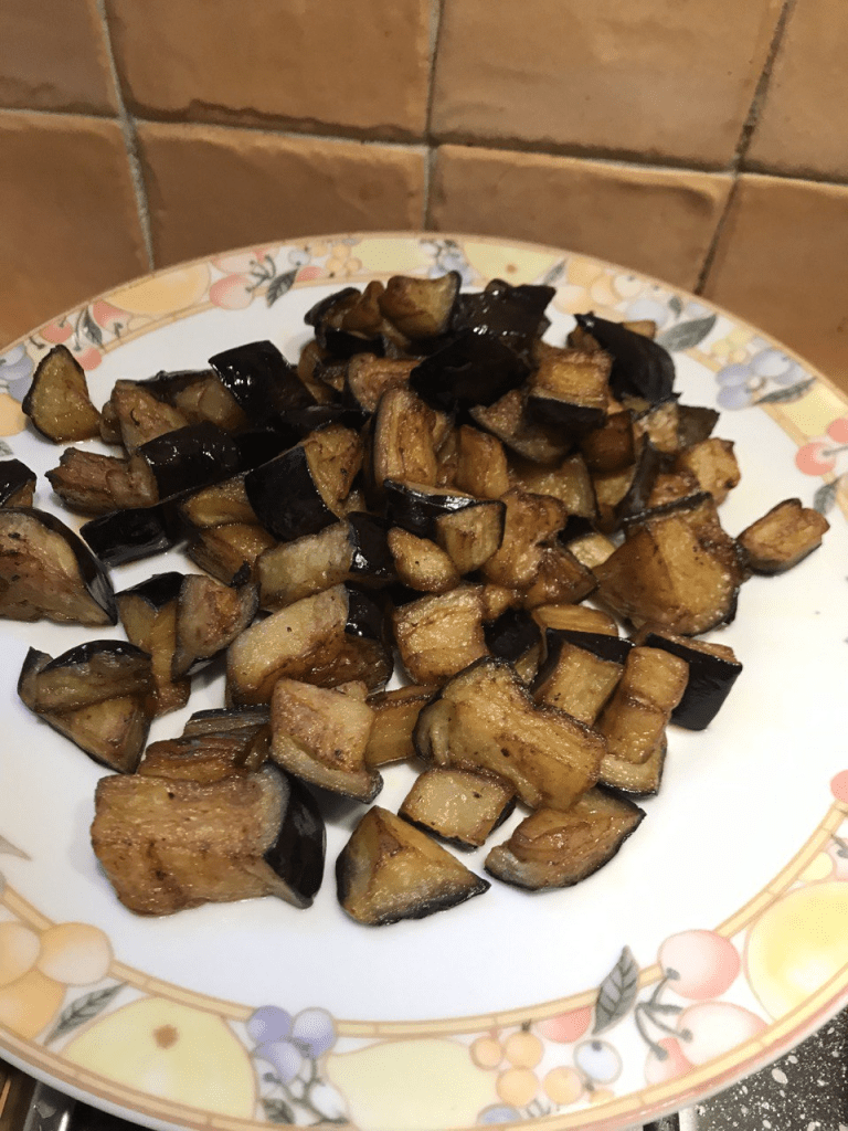 Tagliare le melanzane a cubotti grossolanamente e friggerle in abbondante olio fino a che non siano dorate.