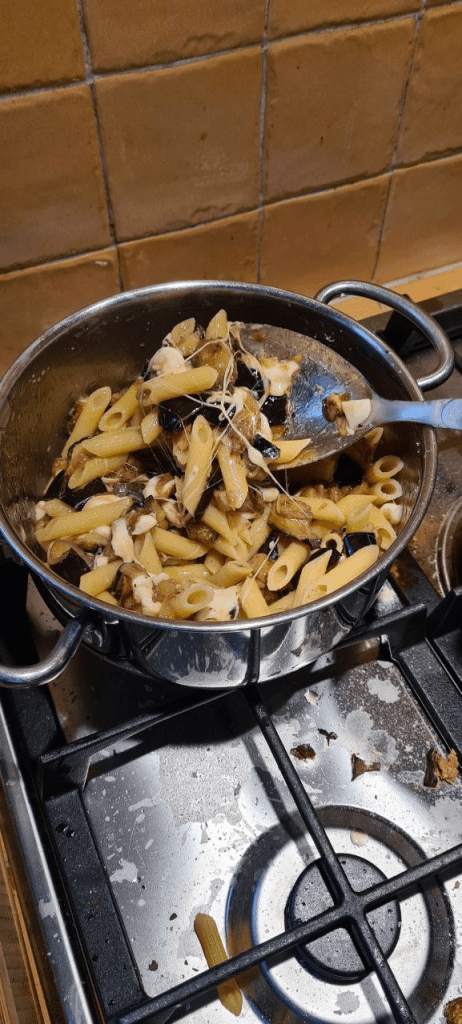 Lessare le penne e scolarle al dente. Versarle in un’ ampia padella insieme al formaggio e alle melanzane avendo cura di lasciare nel piatto l’olio che si sarà depositato. Aggiugere una spolverata di Parmigiano gtrattugiato e far saltare in padella fino a quando il formaggio non si sarà sciolto e amalgamato alla pasta. Servire con una seconda spolverata di Parmigiano su ogni piatto.