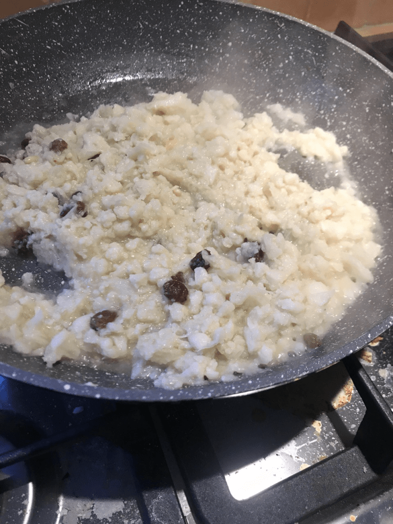 Tostiamo il riso per 2/3 munuti in un tegame con un cucchiaio di olio, aggiungiamo il cavolo e facciamo insaporire mescolando per altri 2/3 minuti, infine aggiungiamo un po’ d’acqua e facciamo asciugare, continuiamo ad aggiungere acqua poco alla volta.Il risotto risulterà cotto quando sarà al dente e “asciutto”.