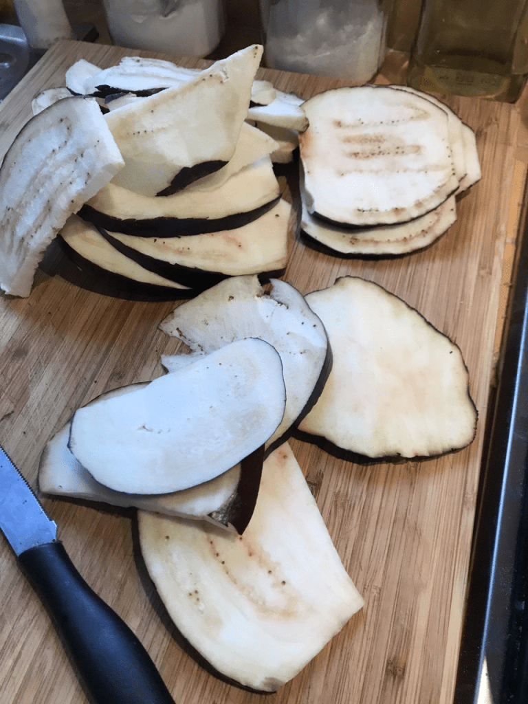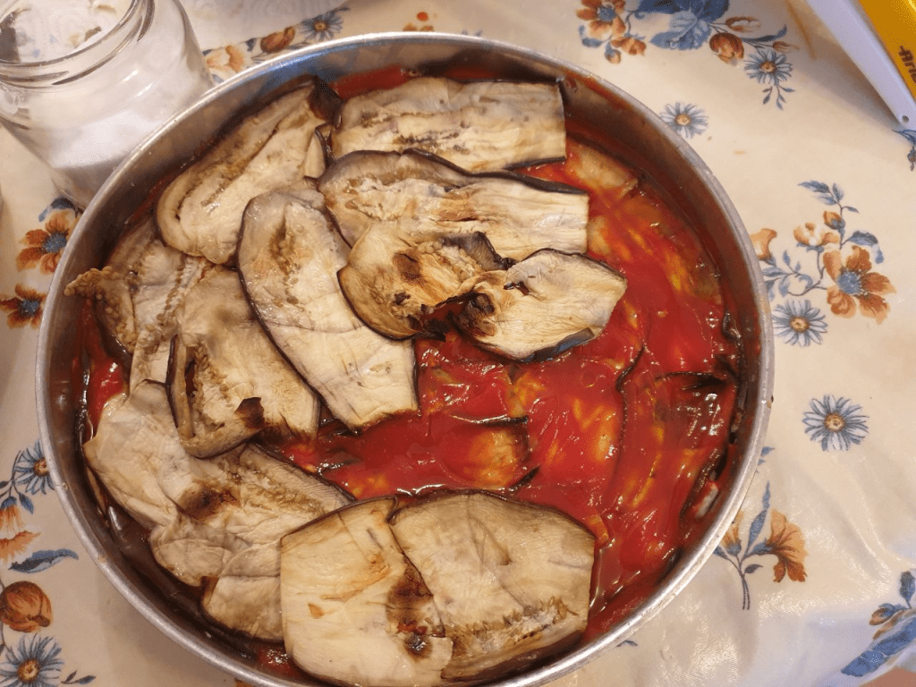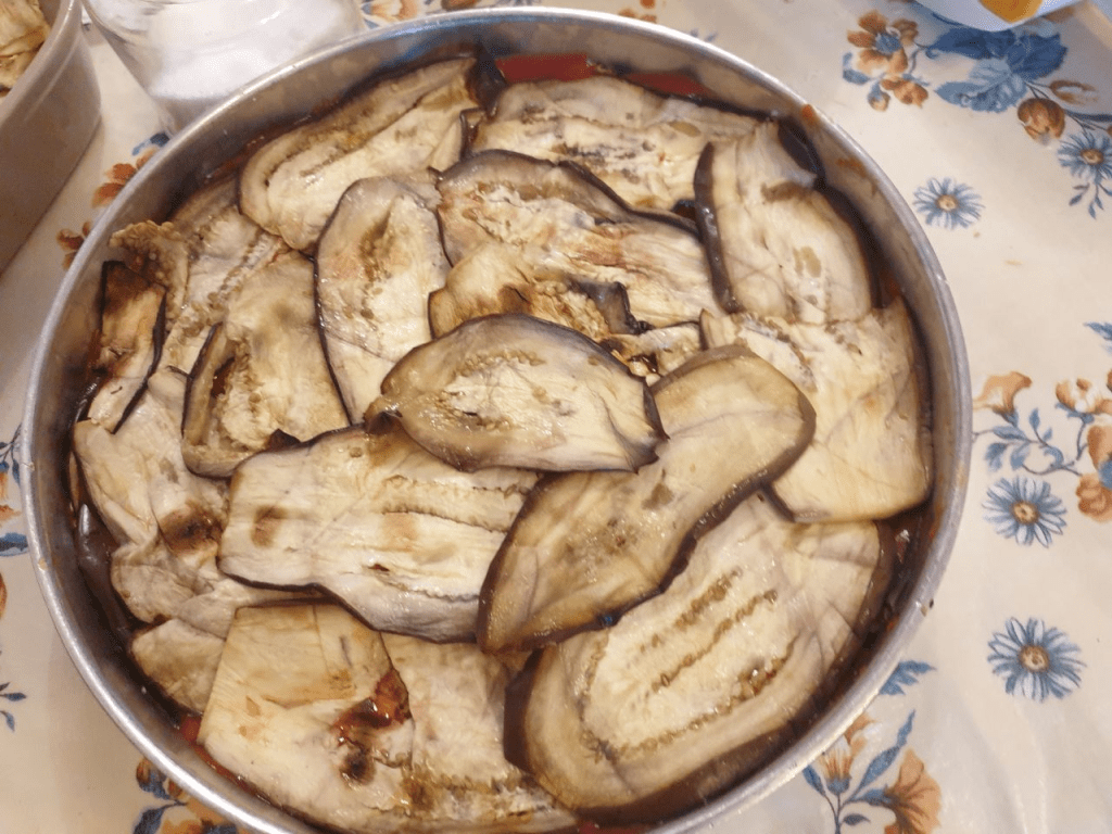 Queste quantità sono adatte per una teglia di 26/ 28 cm e quattro strati di parmigiana oltre l’ultimo di chiusura.