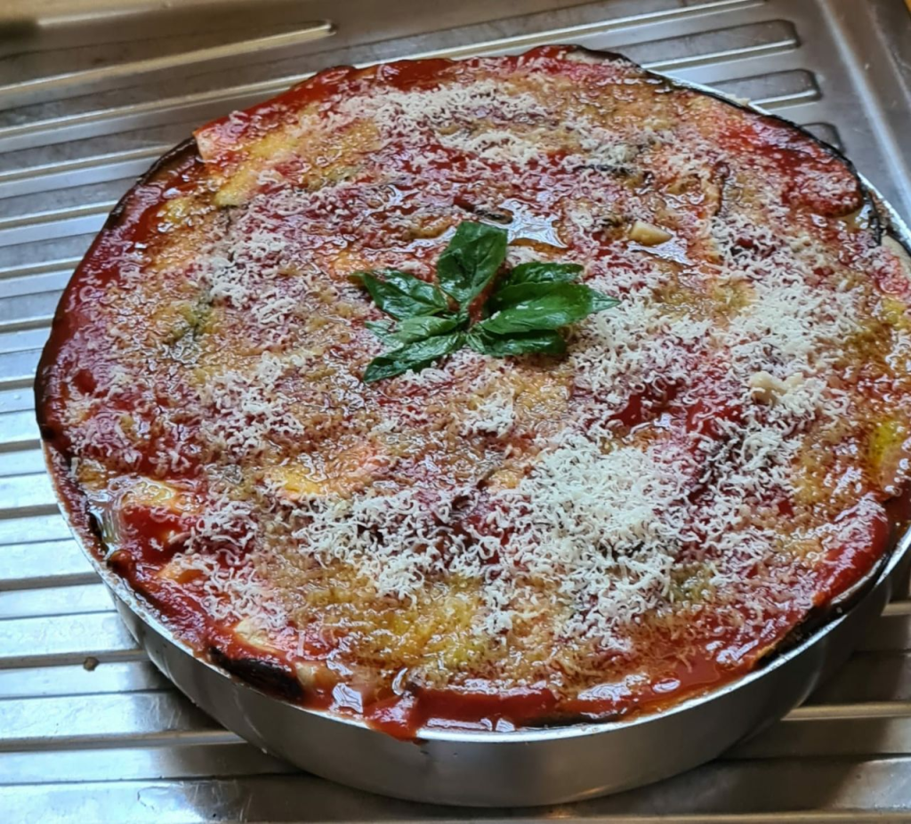 A questo punto disponete un ultimo strato di melanzane, condite solo con la passata di pomodoro cruda, un pizzico di sale, un fili d’olio e un’abbondante grattugiata di prmigiano. Decorate con un ciuffetto di basilico freso e infornate a 180° in forno statico preriscaldato per circa 30 minuti, facendo in modo che si asciughi.