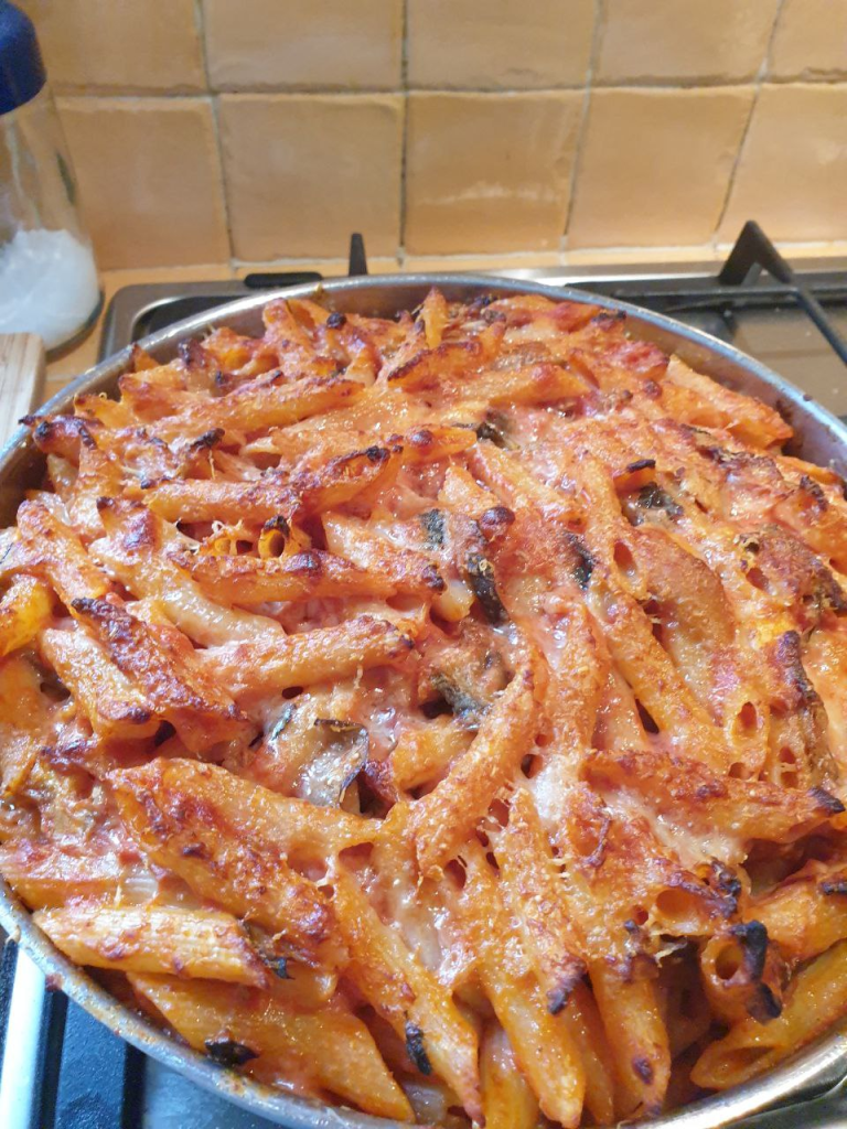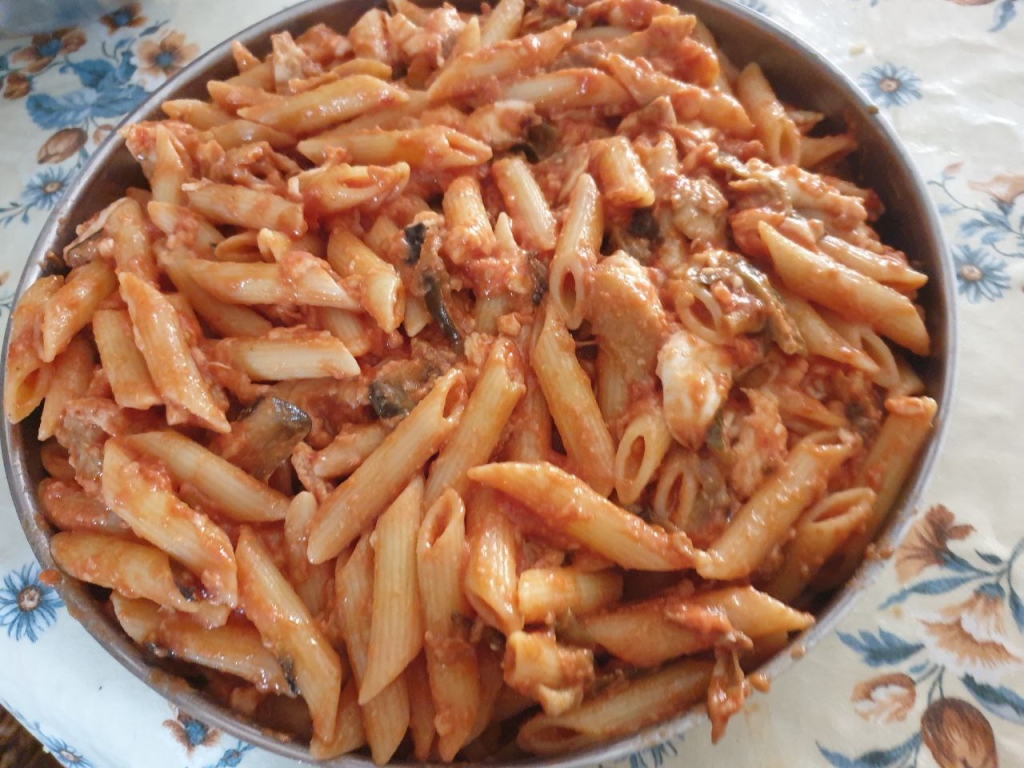 Quando cucino la “parmigiana di melanzane” sono solita lasciarne una/due porzioni circa e, non essendo sufficiente per tutti i membri della famiglia il giorno dopo, preferisco utilizzarla per un timballo di pasta saporito.