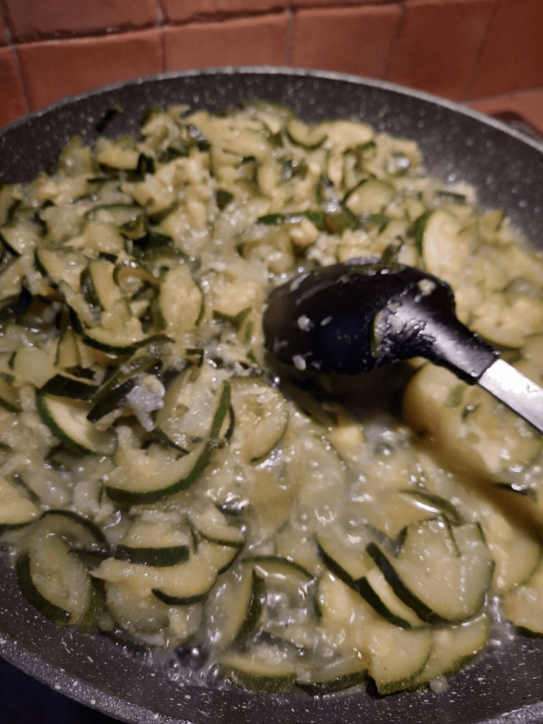 Lavare e tagliare a rondelle, più o meno della stesssa grandezza le zucchine, disporle in una padella, coprirle di acqua per due terzi , aggiungere l’olio, il sale e la cipolla liofilizzata a piacimento. Portare rapidamente a ebollizione, ma fare cuocere a fuoco medio basso per fare appassire e insaporire le zucchine.