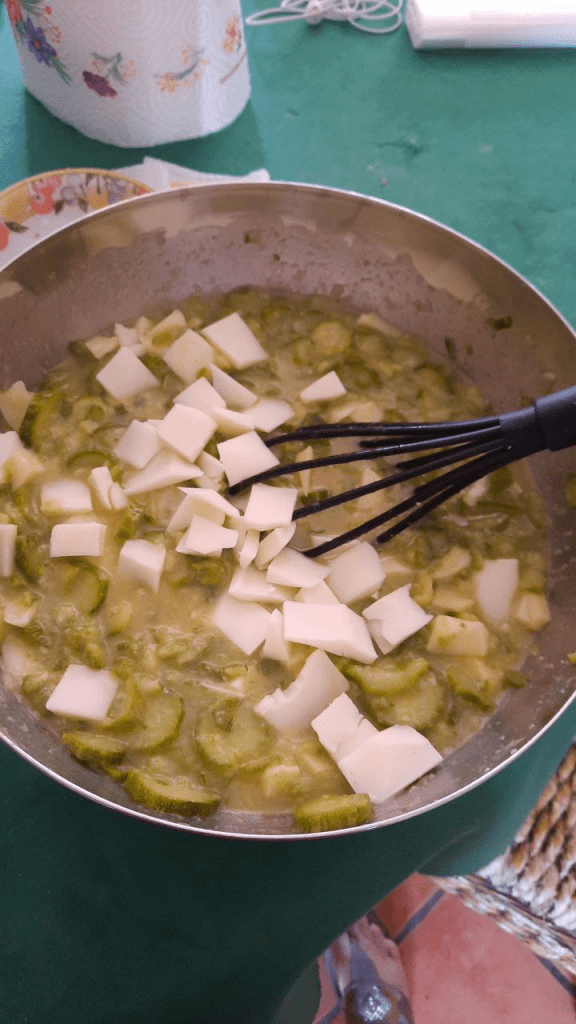 Aggiungete le zucchine a temperatura ambiente (se sono calde l’uovo potrebbe rapprendersi), aggiungete il taleggio e la fesa di tacchino e mescolate per rendere il composto omogeneo.